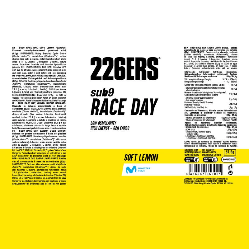Boisson énergétique 226ERS Sub9 87g Race Day Lemon Monodosis