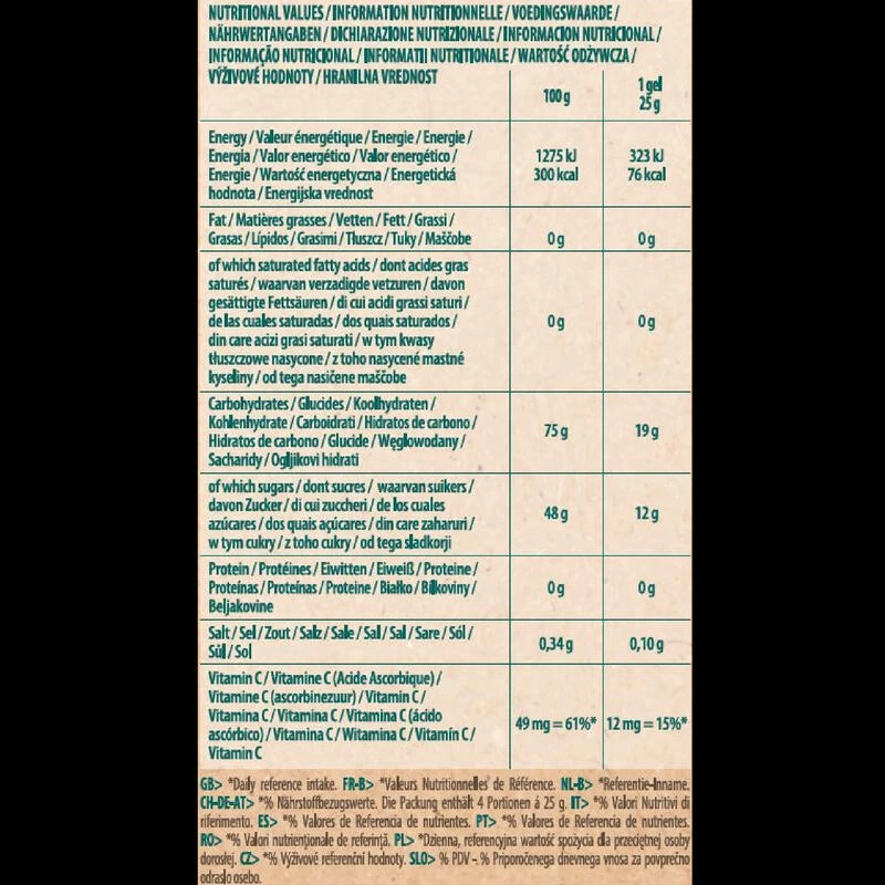 « Valeurs nutritionnelles : 100g | 25g (=1 gel)